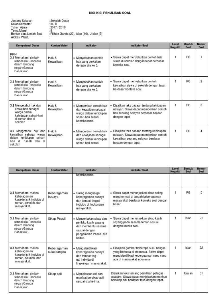 Kisi kisi soal pat kelas 3 tema 8. Kisi-kisi soal merupakan bagian penting dalam penyusunan soal karena akan membantu si pembuat soal menjadi lebih mudah untuk melakukan penyusunan soal. Tepat 90 derajat d. Demikianlah Kisi-Kisi PAT UKK Kelas 6 VI SDMI Tema 8 Semester 2 Kurikulum 2013 yang dapat saya bagikan smeoga bermanfaat.