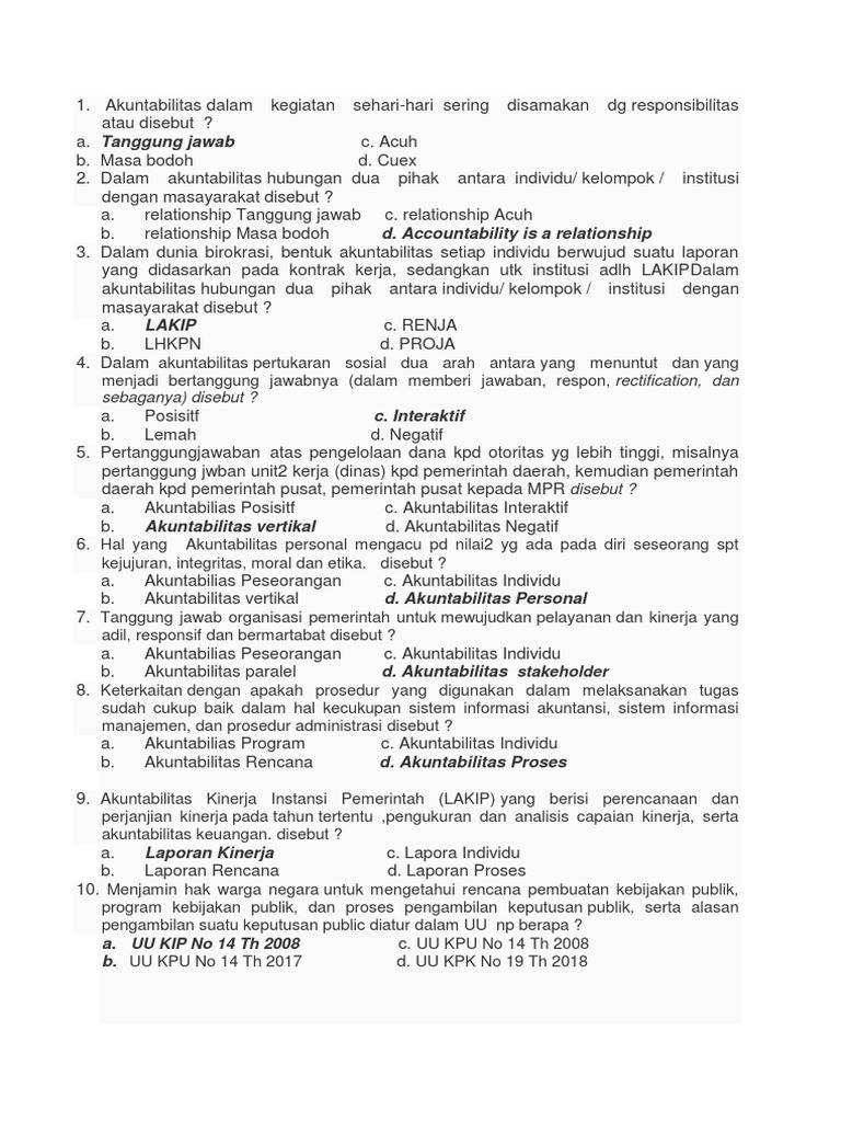 Konsep tentang akuntabilitas berkembang dari pendapat bahwa siapapun yang diserahi tugas mendidik harus dapat mempertanggungjawabkan tugasnya itu. Contoh soal dan jawaban ujian sertifikasi auditor dasar dasar auditing sakn 1 akuntabilitas instansi pemerintah auditing. PILIHAN GANDA 1.