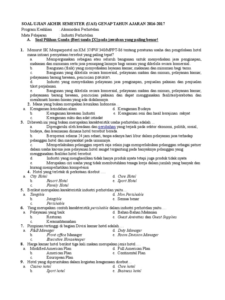 Soal Uas Industri Perhotelan Smt Genap 2016 2017