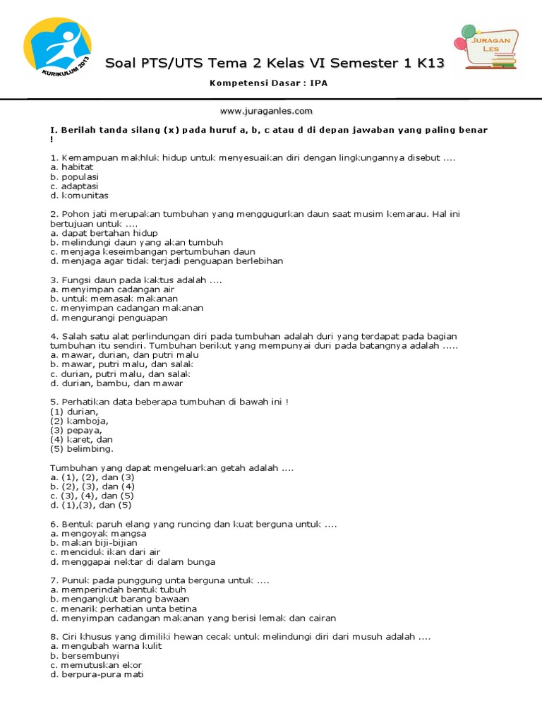 Soal Uts Pts Tema 1 Kelas 6 Semester 1 Kurikulum 2013 Revisi 2018 Juragan Les