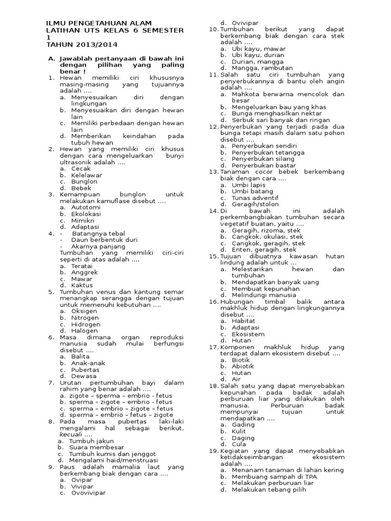 Soal sudah dilengkapi dengan kunci jawaban. Berikut ini adalah contoh soal UTS IPA kelas 6 semester 1 terbaru tahun ajaran 20182019. Selamat datang kembali rekan rekan pendidik dan wali murid.